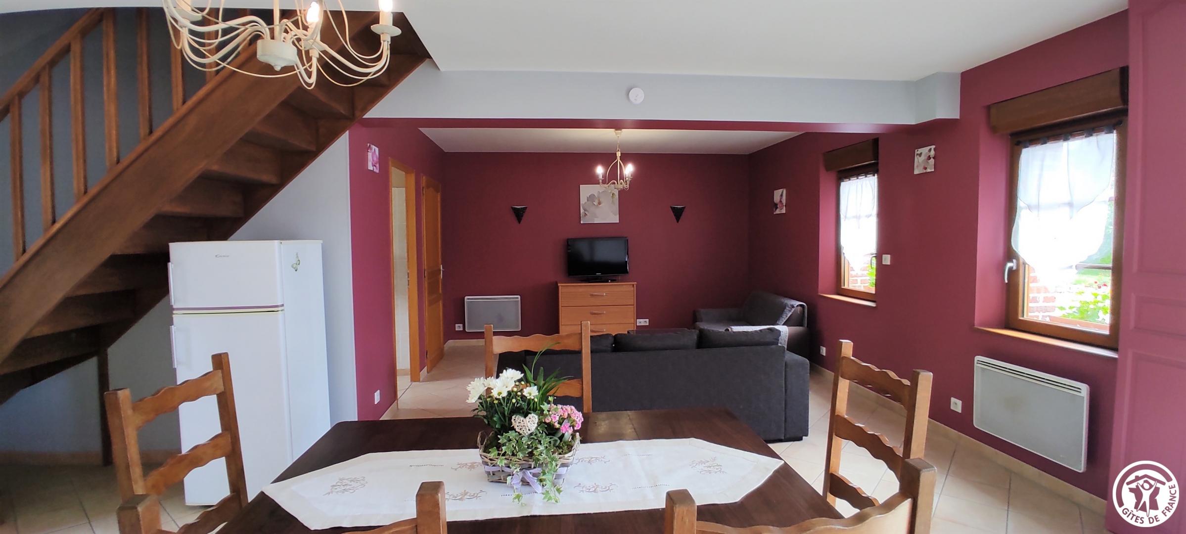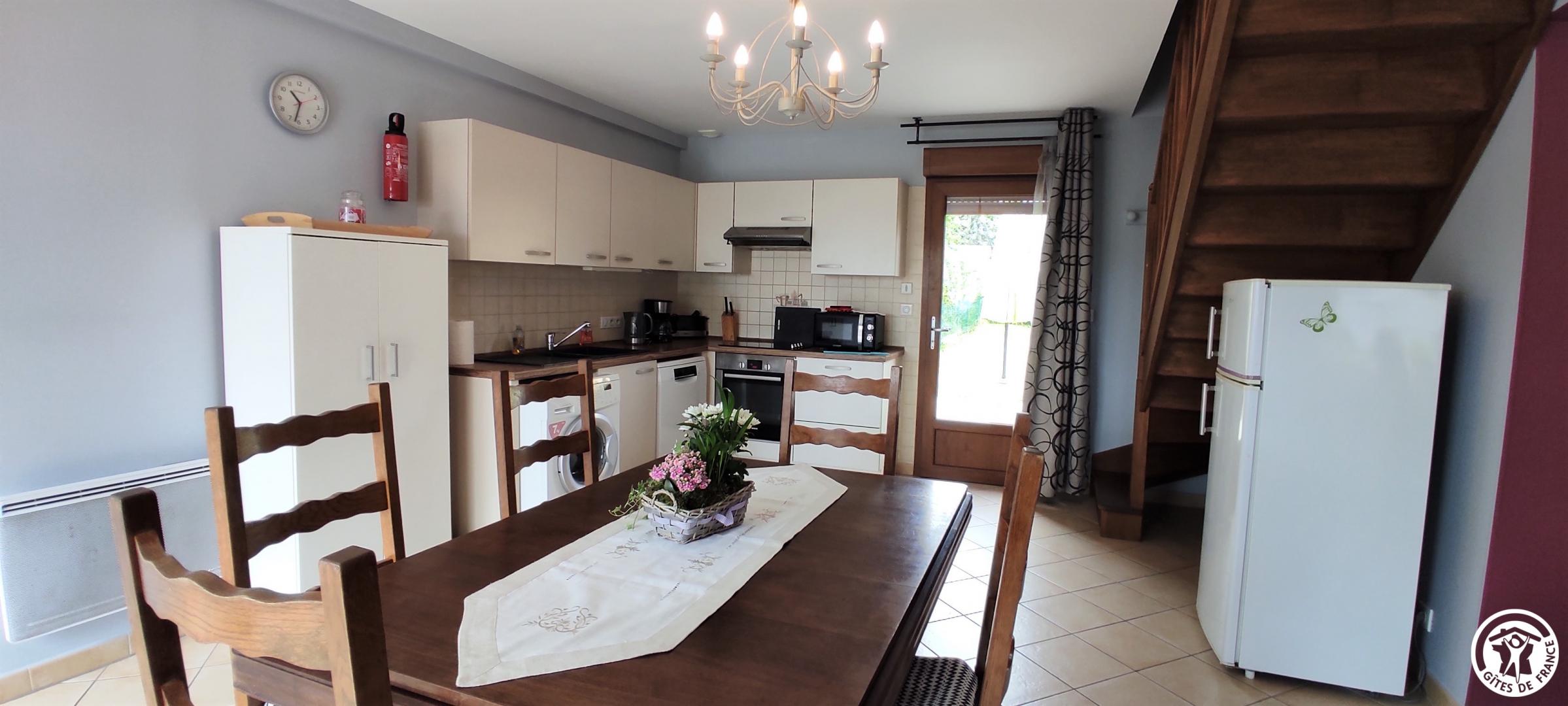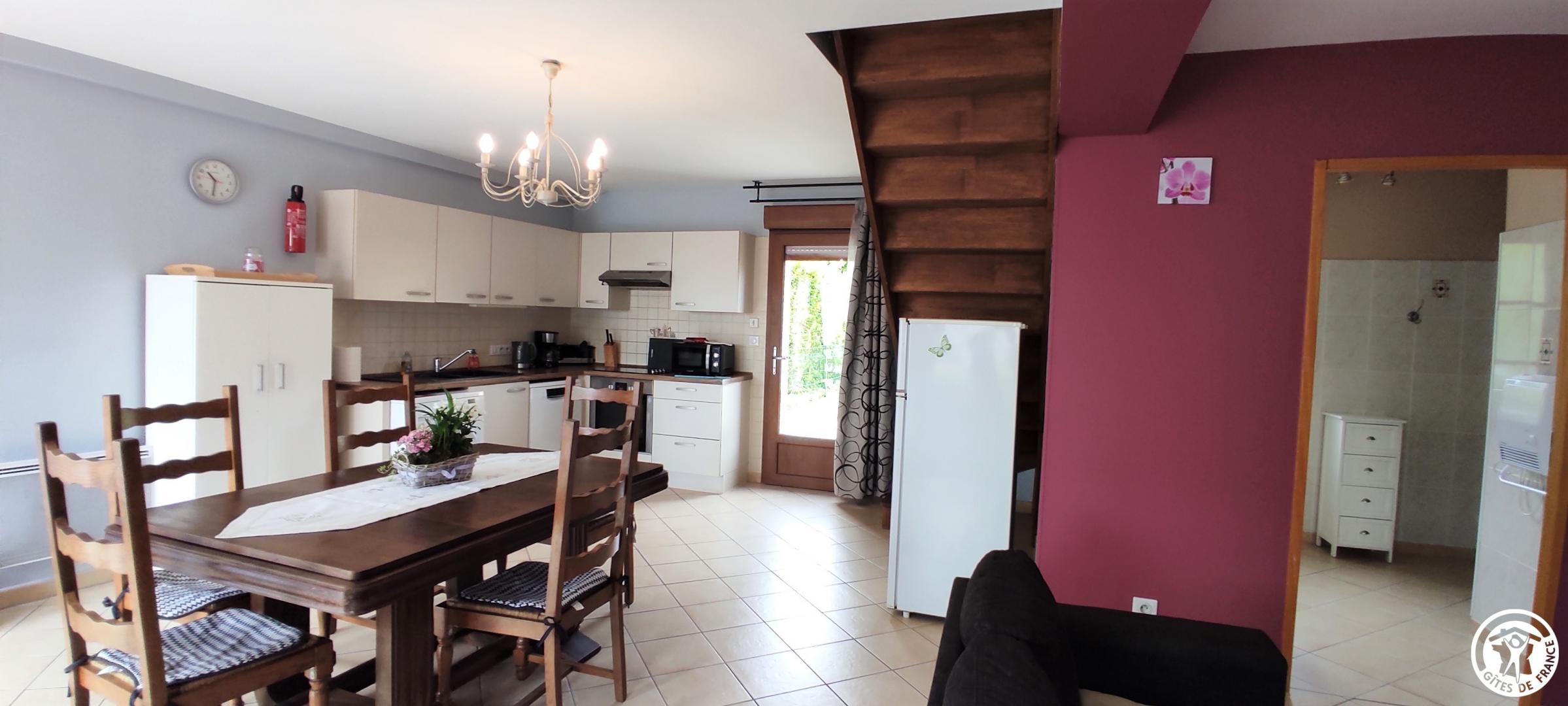 Gîte de 85 m² aménagé sur 2 niveaux pour 5 personnes avec 2 chambres, 2 salles d'eau/bain. Au rez-de-chaussée : cuisine toute équipée et ouverte sur grande pièce à vivre (lave-vaisselle, lave-linge) - Salon avec télévision - Salle d'eau - WC indépendant. A l'étage : 2 chambres (3 lits 1 personne - 1 lit 2 personnes 160x190) . Jardin clos indépendant (salon de jardin, barbecue)(135m²); Stationnement dans la cour fermée à partager avec le 2ème gite sur place. Wifi- Chauffage :relevé de compteur électrique à régler sur place . Ménage fin de séjour inclus dans le prix Équipement bébé à la demande. Ce gite n'est pas accessible aux personnes en situation de handicap.