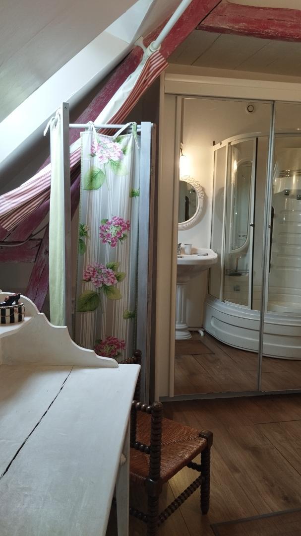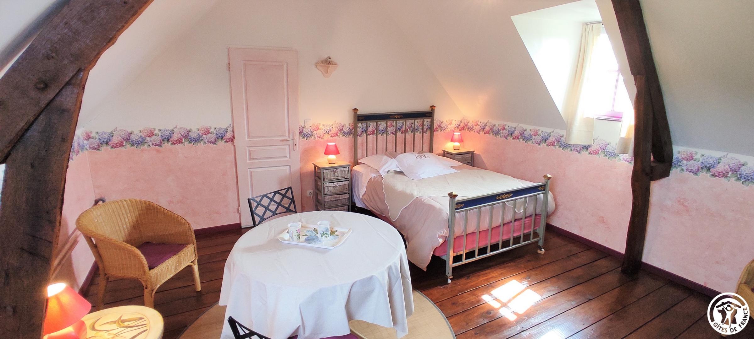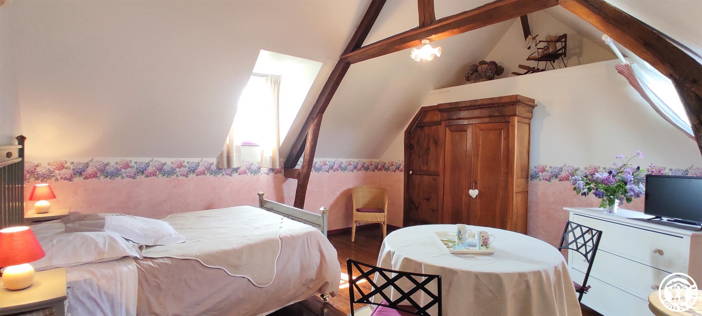 Marie-Laure vous accueille dans sa chambre d'hôtes "Aux Hortensias", une charmante chambre située au 1er étage de sa maison avec une entrée indépendante. Cette chambre confortable est aménagée pour accueillir de 2 à 3 personnes et dispose d'un lit double (140x190 cm). Sur demande, la propriétaire peut installer un lit supplémentaire de 90x190 cm pour une troisième personne. Vous bénéficierez d'une TV et d'un coin repas équipé avec une table, des chaises, un réfrigérateur et un micro-ondes pour faciliter vos repas. Salle d'eau (douche, WC) privative vous garantissant votre confort et intimité. Vous pourrez également profiter d'un magnifique jardin de 4500 m² avec un coin potager, idéal pour se détendre ou se promener. Un parking privé est disponible à l'intérieur de la propriété fermée, assurant la sécurité de votre véhicule. La chambre est équipée d'Internet Fibre pour un accès rapide et fiable à la connexion Wi-Fi, parfait pour les séjours d'affaires ou les vacances connectées.