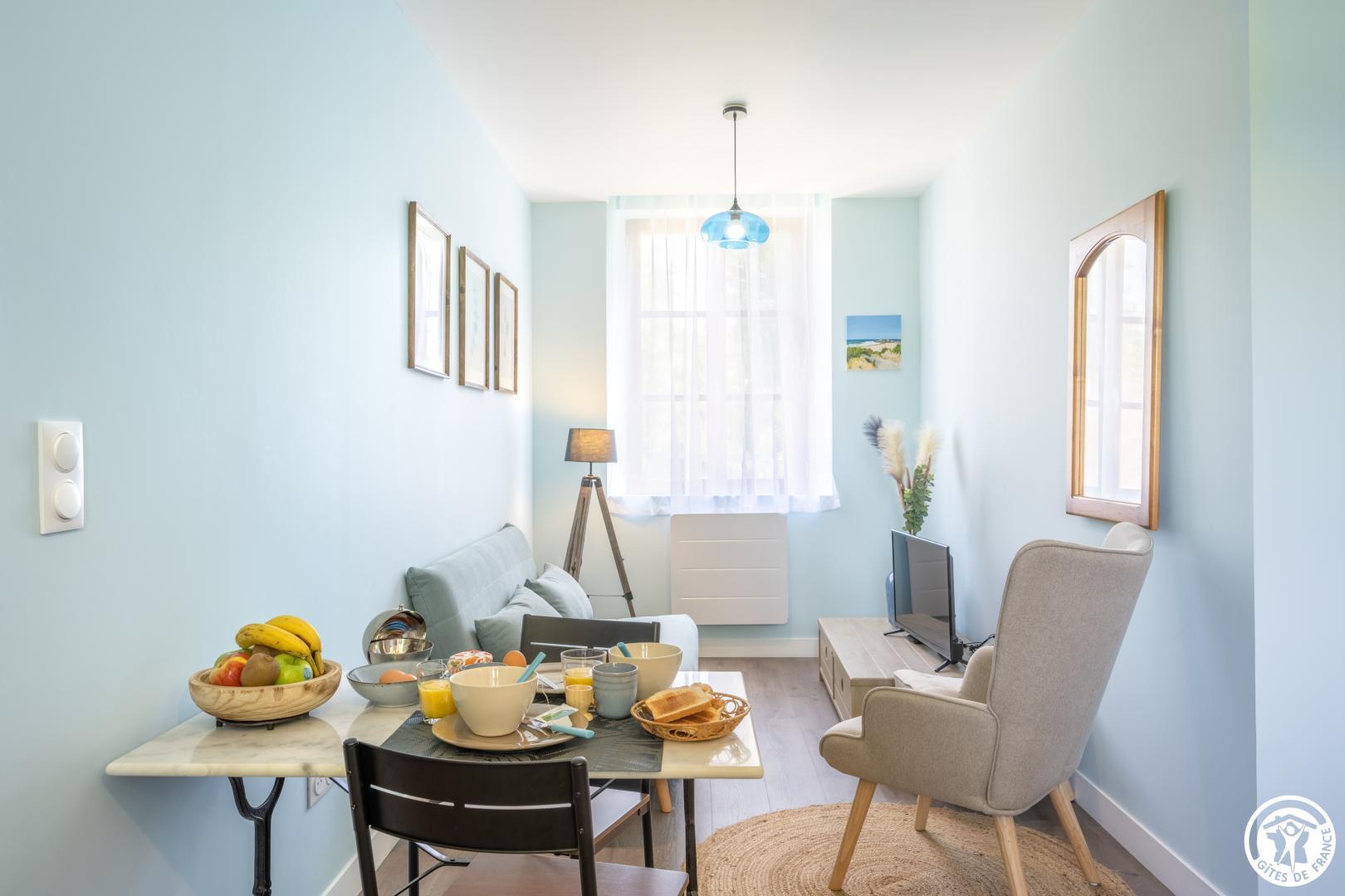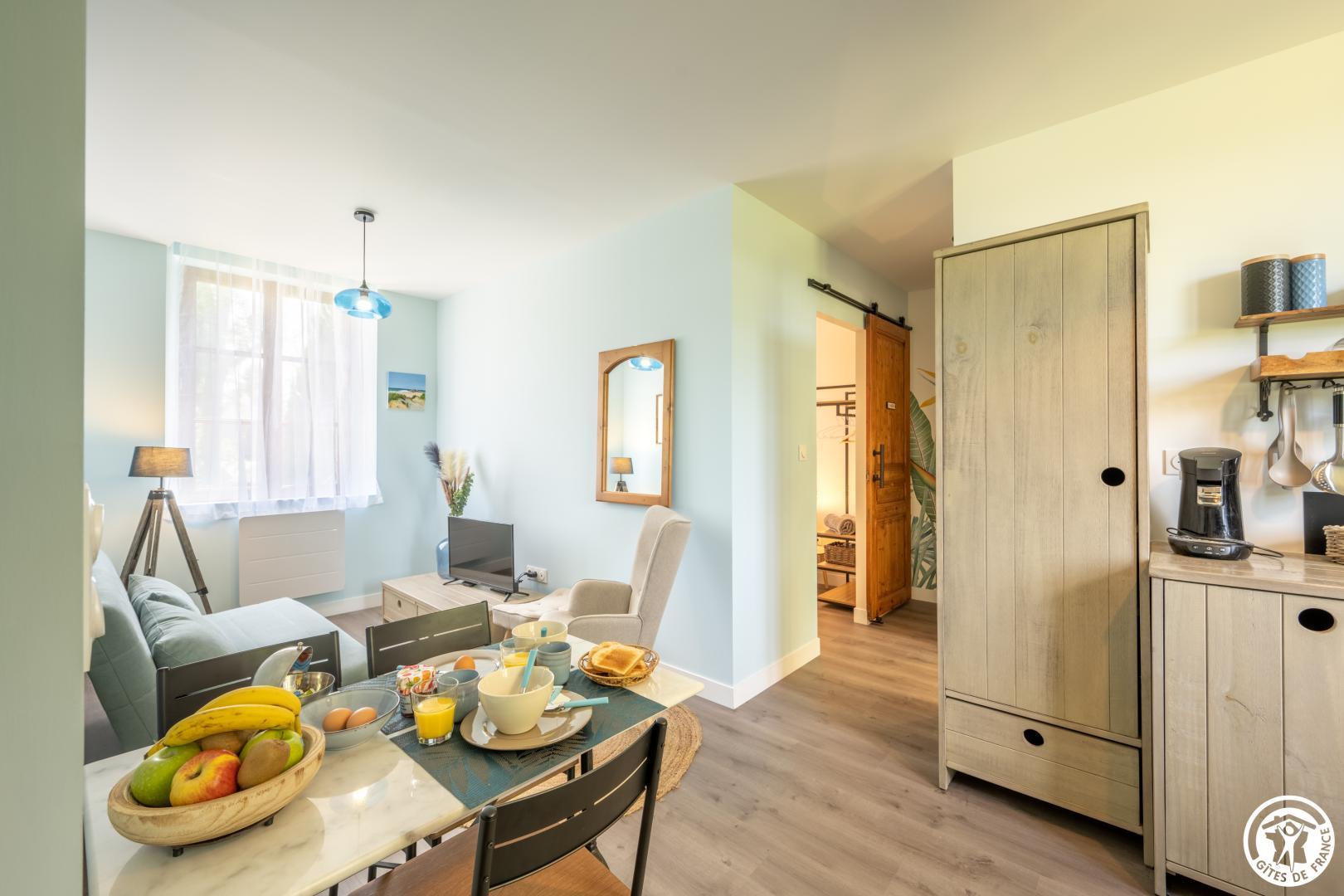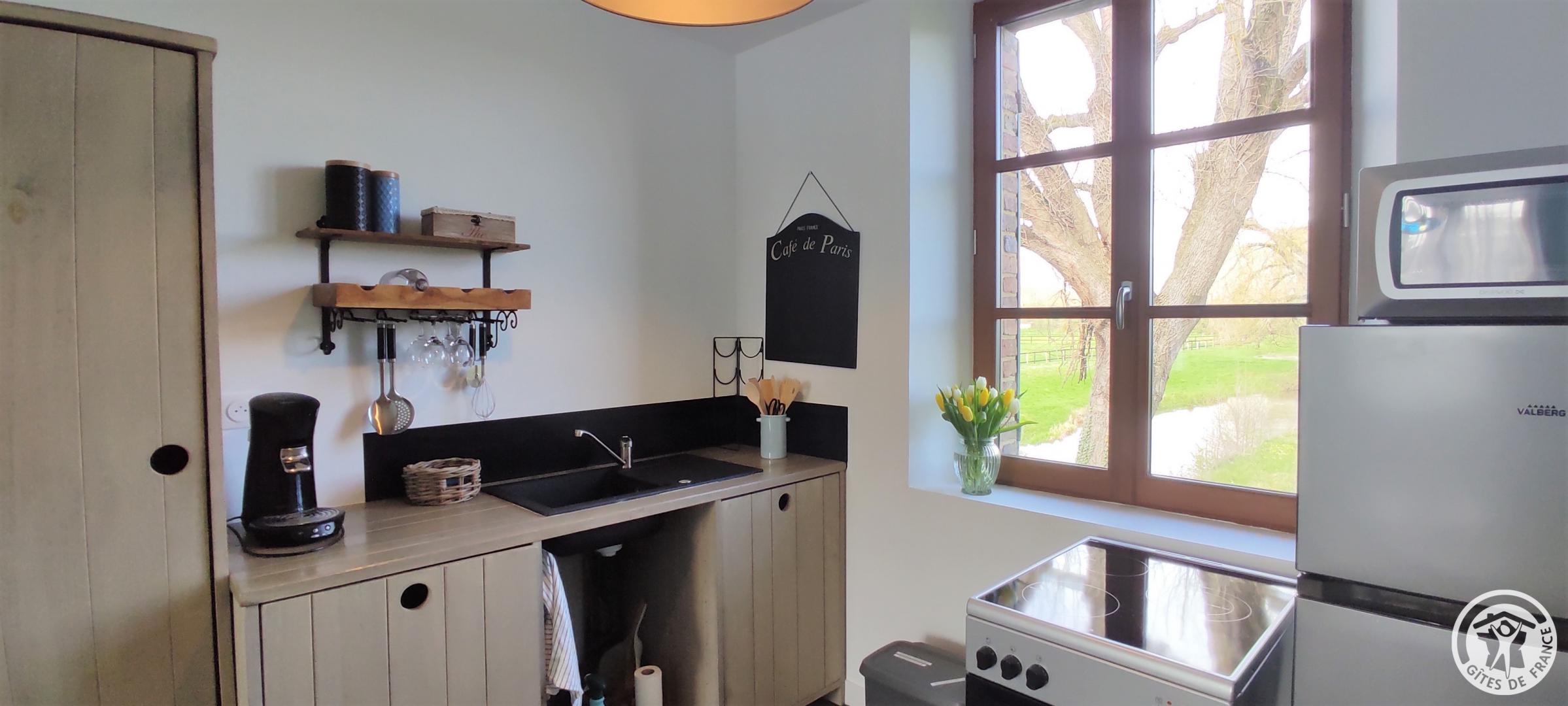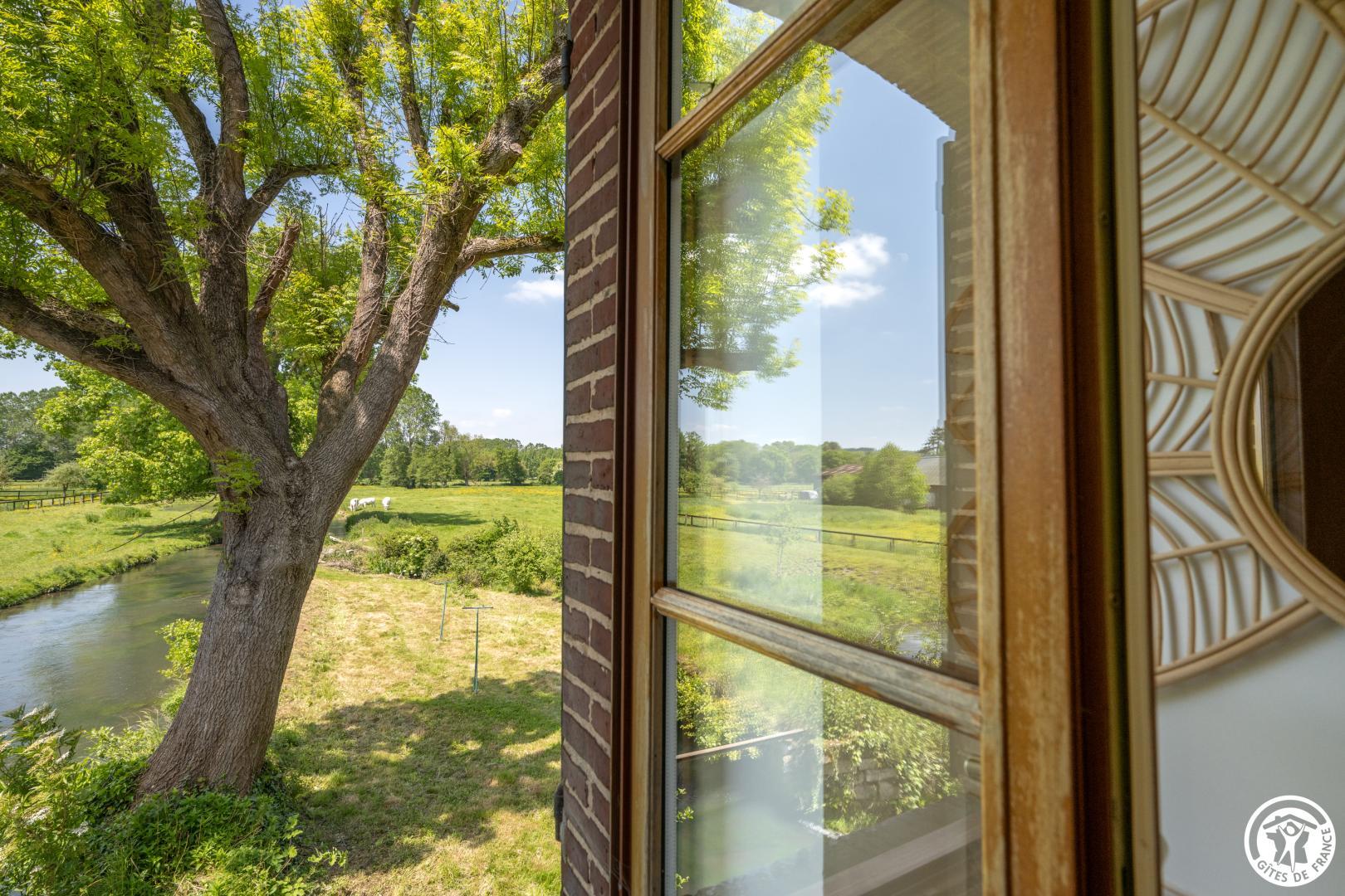Appartement de 30 m² situé au 1er étage de la maison des propriétaires, situé en bordure de Thérain. Vous entrez au rez-de chaussée dans une salle de jeux avec baby-foot et vue sur l'ancienne roue du moulin. Le gite se situe à l'étage et profite d'une vue traversante sur la rivière Thérain. Vous disposez d' une pièce de vie avec cuisine équipée (micro-onde, cuisinière avec four et plaque de cuisson, réfrigérateur, congélateur, cafetière, grille pain et bouilloire, lave-linge), un salon avec canapé convertible, TV (110 cm), une petite chambre pour 2 personnes (lit 140x190 cm), une salle d'eau (douche 0,85 x 1,18 cm) avec Wc, meuble vasque (sèche cheveux). Dans le jardin ( commun aux propriétaires) vous profiterez du bruit de l'eau en vous installant sur la terrasse avec salon de jardin, barbecue. Stationnement dans la cour devant le gite. Lits faits à votre arrivée, Linge de maison, de toilette, électricité, chauffage, ménage de fin de séjour compris. Internet (fibre)