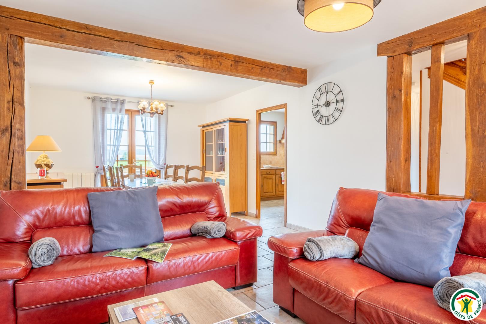 "Le Gite du Village" est un gite de 128 m² pour 7 personnes, aménagé sur 2 niveaux situé en face de l'exploitation agricole des propriétaires. Vous pourrez d'ailleurs profiter de la vue sur les vaches et les veaux depuis le séjour ou le jardin. Au rez-de-chaussée : Entrée, cuisine équipée (lave-vaisselle, micro-ondes, four... ). Séjour avec canapés, TV (80 cm), salle à manger , Wi-Fi (fibre), salle de bains avec baignoire, douche (80 x 80cm) , double vasque, sèche cheveux, lave-linge, WC Indépendant. Une chambre avec lit 140x190. A l'étage : Trois chambres avec lit double 140x190, une salle d'eau avec douche (90x90 cm) , meuble vasque et WC indépendant. Vous aurez la possibilité de profiter d'un jardin privatif clos de 1100 m² avec terrasse, salon de jardin, chaises longues, store électrique et barbecue. Le parking est sécurisé dans la cour fermée du gite (possibilité de stationner 3 voitures). Tout est compris dans le prix de la location.